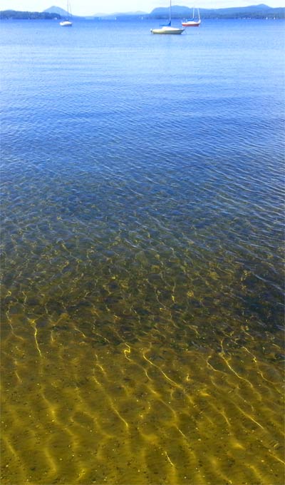 Le Lac Memphrémagog a une étendue de plus de 42 kilomètres et il a la forme d’un boomerang!  Cette forme de boomerang n’est pas étranger au fait que les visiteurs reviennent année après année pour profiter de ses eaux limpides.  N’est-ce pas qu’elle est claire cette eau comme en témoigne cette photo?